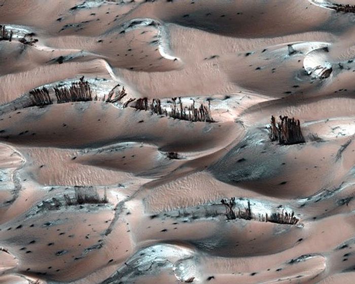 . NASA has released some images from the surface of Mars in these images you can see what appear to be trees. A Nasa probe has sent back photographs of what appears to be trees on the planets surface. There is a large sand dune region in the highlands north of Mars.